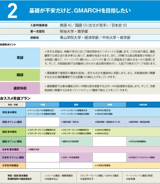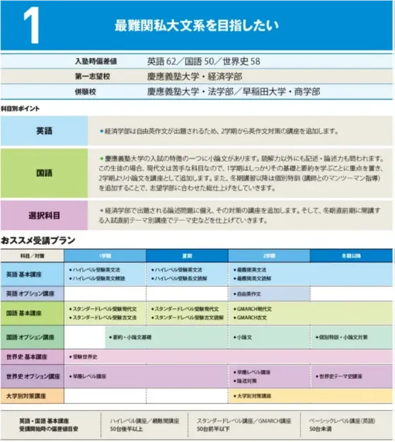 志望大学・学部別に必要な内容にフォーカスした「大学別特別講座」があります。各大学学部の入試の特性に合わせた増田塾オリジナルの講座です。 豊富な難関私大受験指導ノウハウと創設以来24年間蓄積した精度の高いデータをもとに増田塾が独自に作り上げた特別講座です。以下、いくつかの講座例を紹介します。