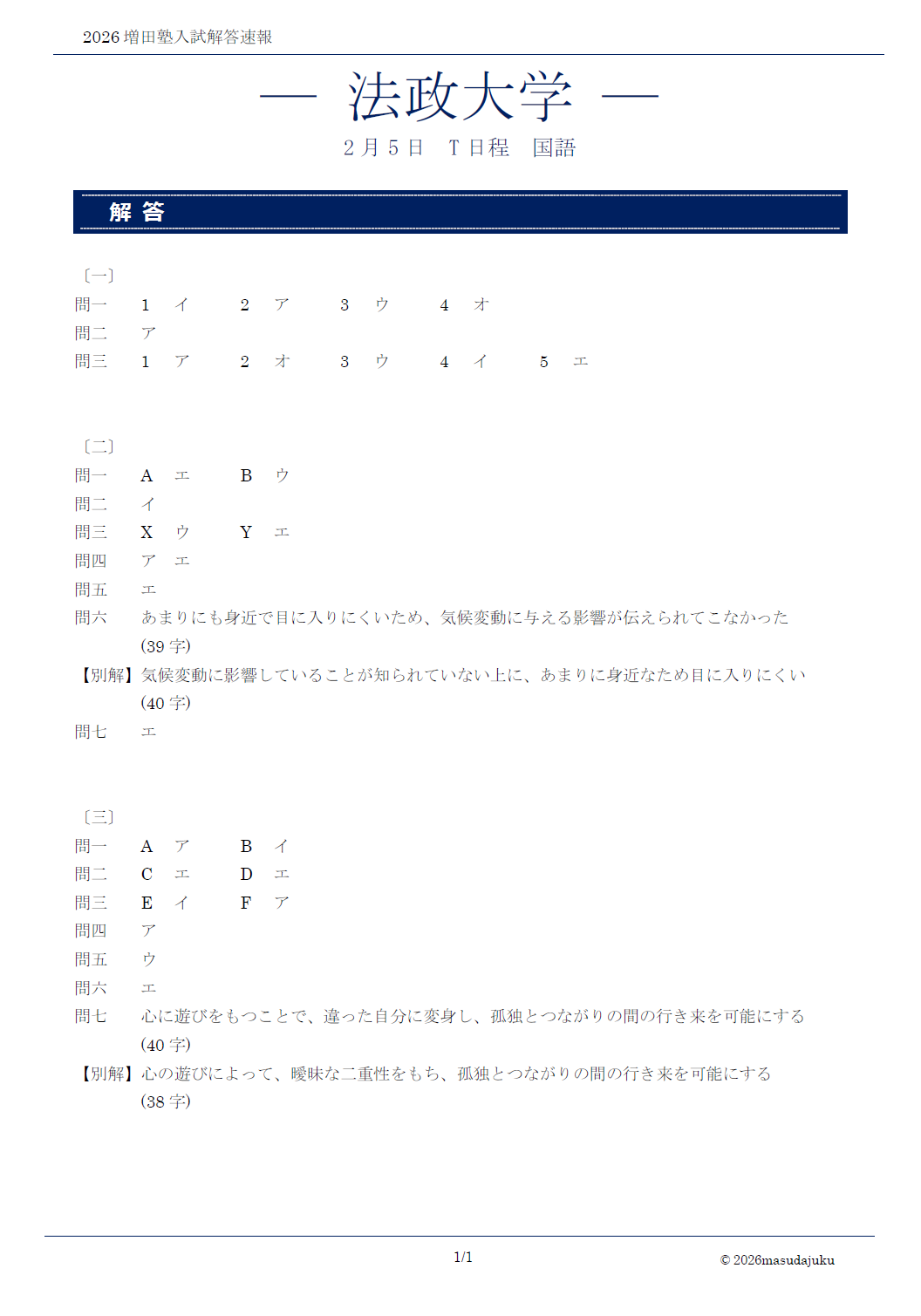法政大学 T日程 国語解答